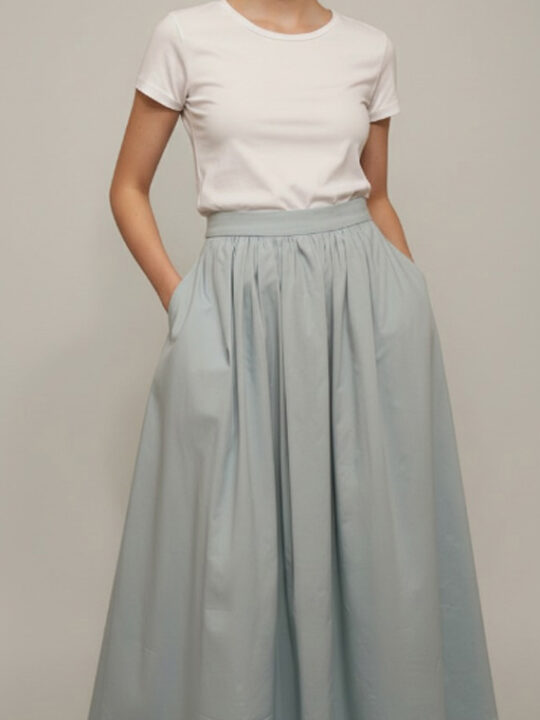 СпідниціВикрійка : Спідниця міді з високою посадкою на талії та елегантним розкльошеним силуетом. Спереду пояс гладкий, ззаду — на резинках для комфортної посадки без застібки. М’які складки створюють об’єм і плавне розкльошення, а кишені в бокових швах додають зручності. Довжина — до щиколотки.