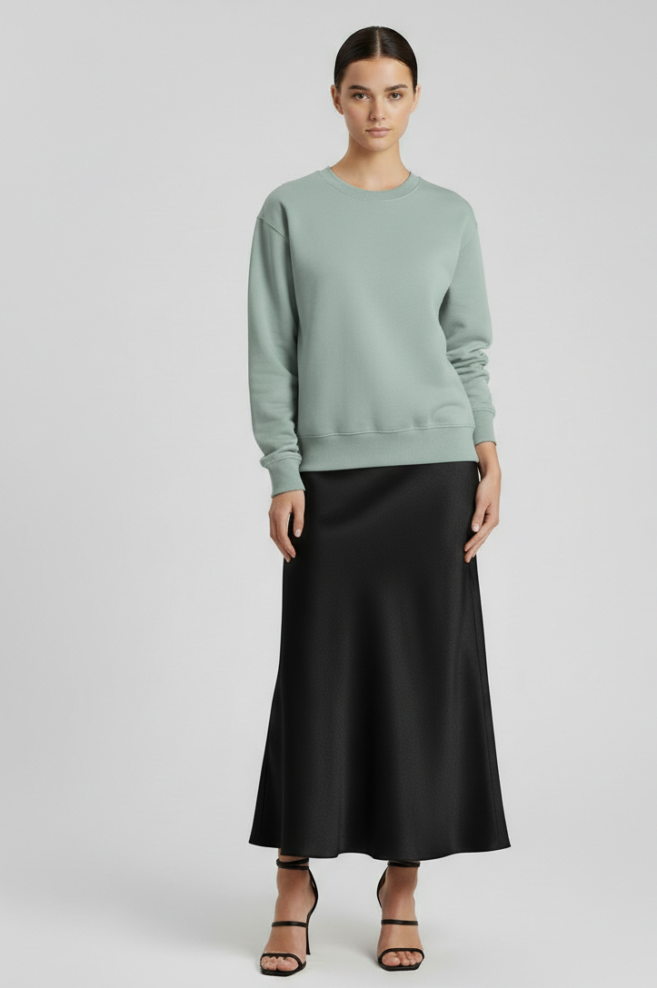 Викрійка: Світшот вільного силуету. Довгий вільний рукав. Низ світшота та рукава оформлений притачною манжетою. Горловина має круглий виріз, оброблена бейкою з рибани.